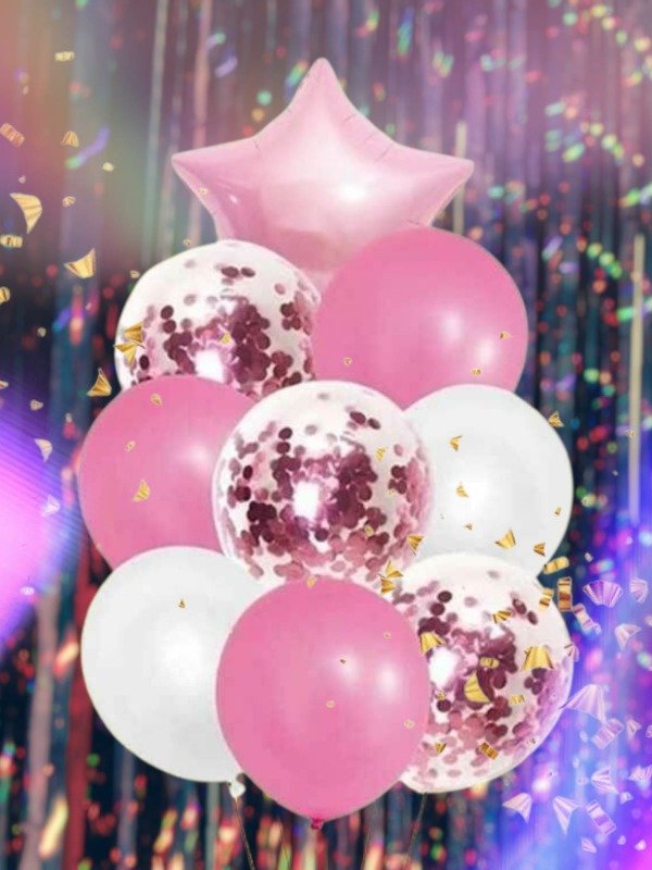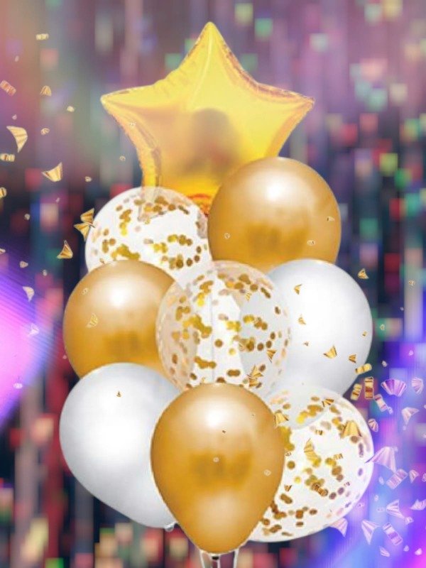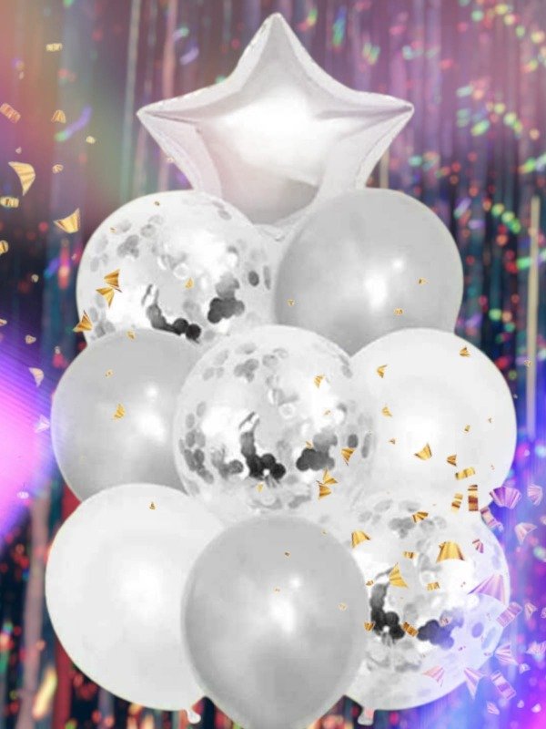 Incluye: 1 globo metalizado estrella de color, 3 globos confeti 12 pulgadas, 5 globos látex perlados (2 blancos, 3 de color).
